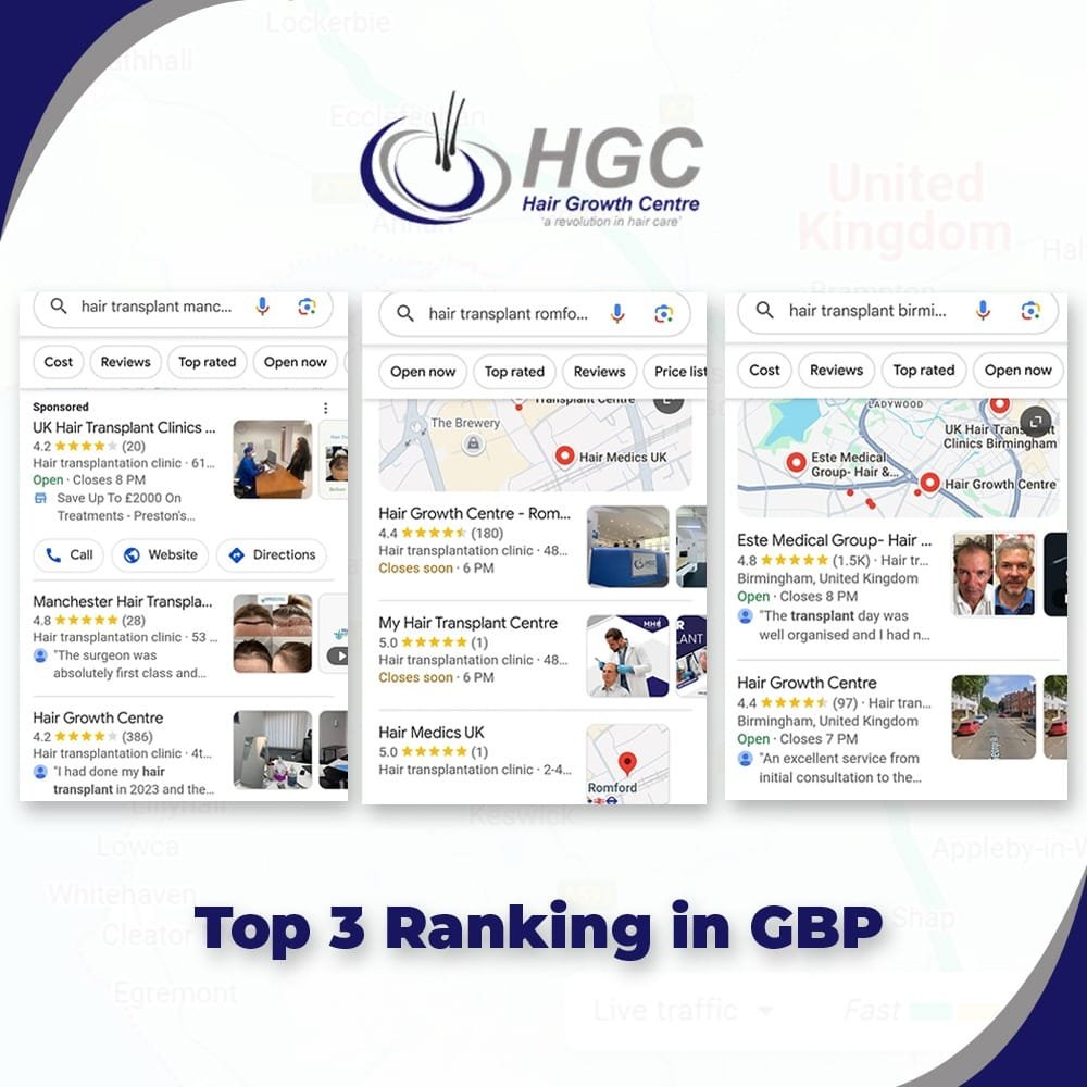 About – Hair Growth Center is a renowned hair transplant clinic with 8 locations across the UK, offering expert solutions for hair restoration. Since 2016, our GMB efforts have driven over 1,200 calls Per Month and secured top-3 rankings for keywords like “hair transplant Romford,” “hair transplant Manchester,” and “hair transplant Birmingham.”